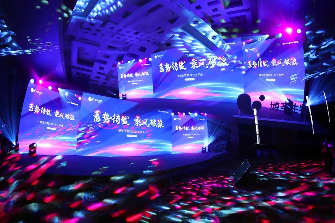 2021年3月7日,博圣生物2021云上年會在杭州海外?;使诖缶频曷≈嘏e行,因疫情防控、減少聚集的需要,本次年會特別開放線上通道,未到場的博圣伙伴通過觀看直播與到場嘉賓一起共享一年一度的盛大聚會。